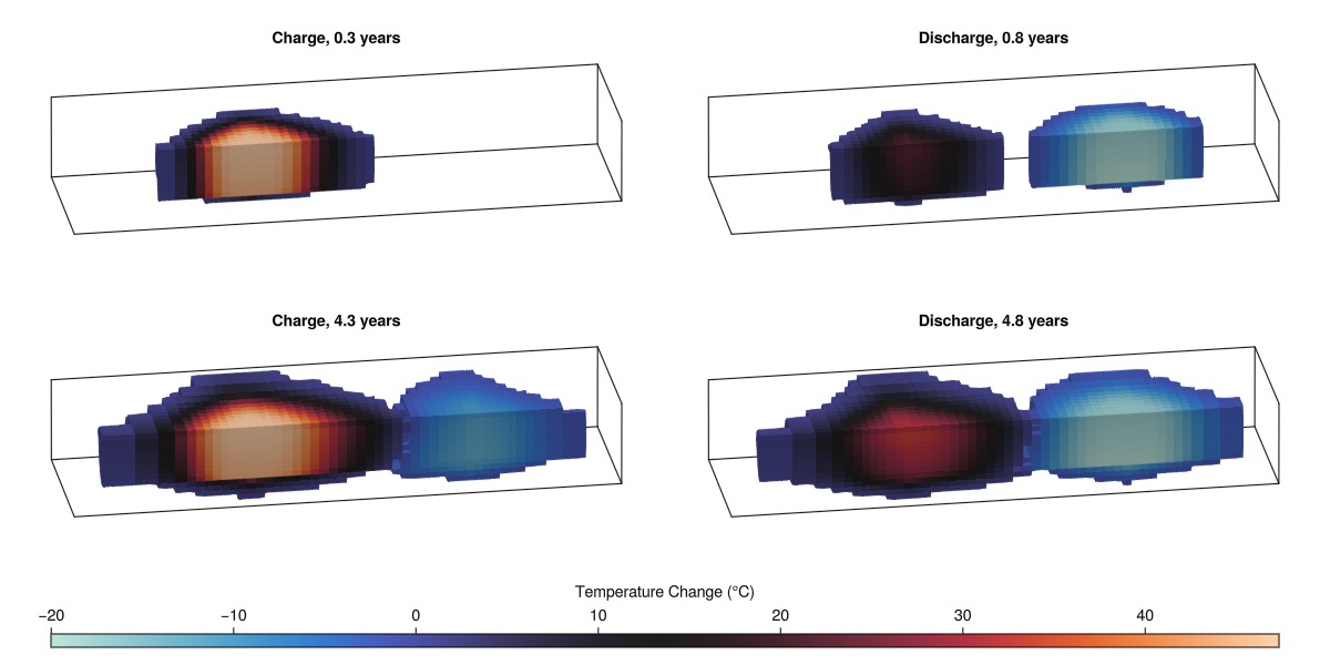 The simulation models a two-well ATES system operating over multiple annual cycles, examining thermal efficiency, energy recovery rates, and aquifer temperature evolution. Key performance metrics include energy recovery efficiency and thermal plume propagation within the confined aquifer system.