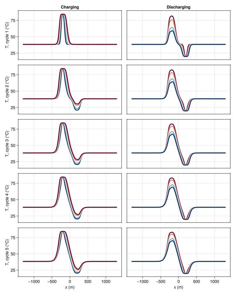 end;Plot temperature profiles during charge and discharge stages for all cycles. This shows thermal plume evolution and migration patterns over multiple years