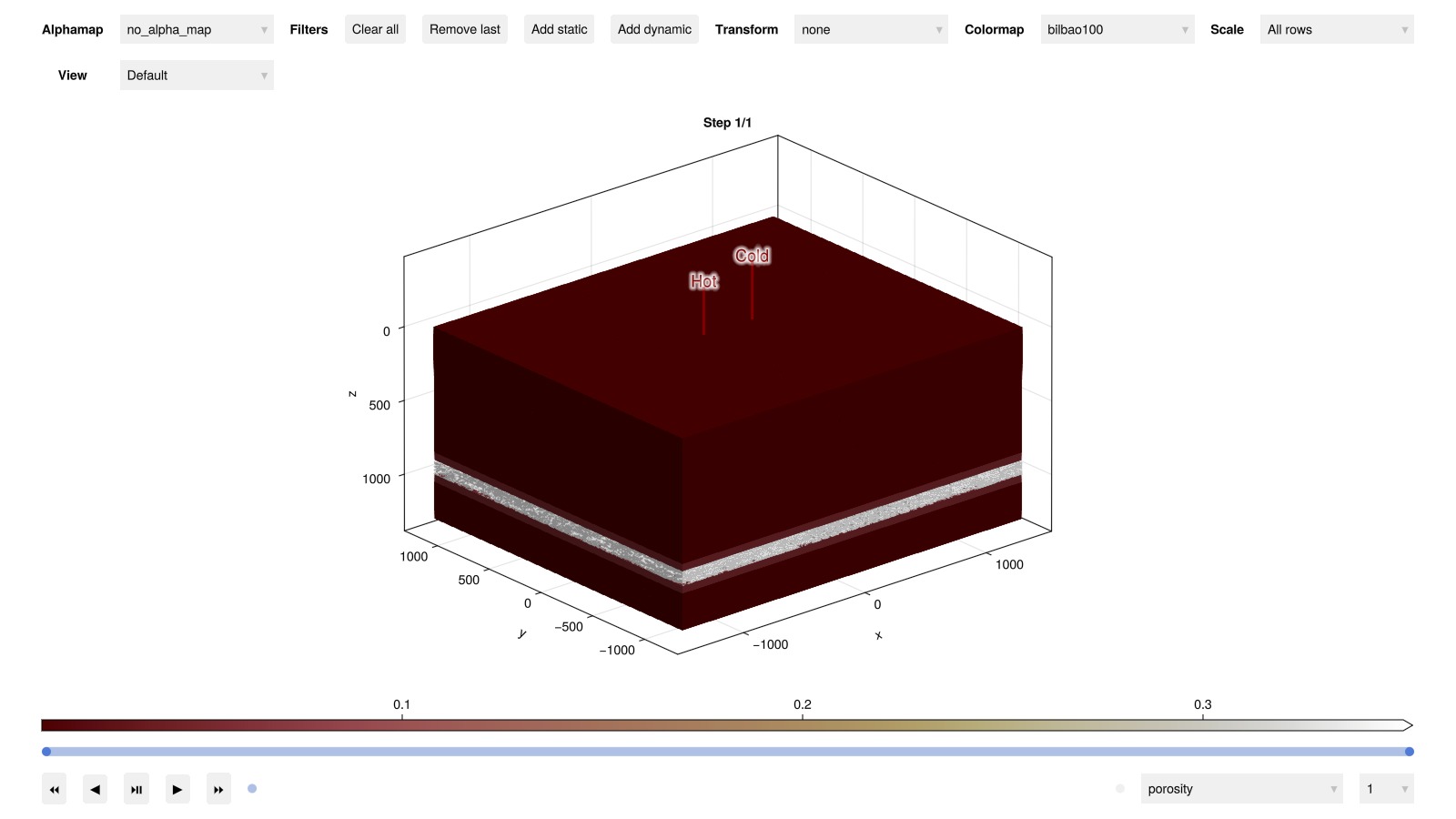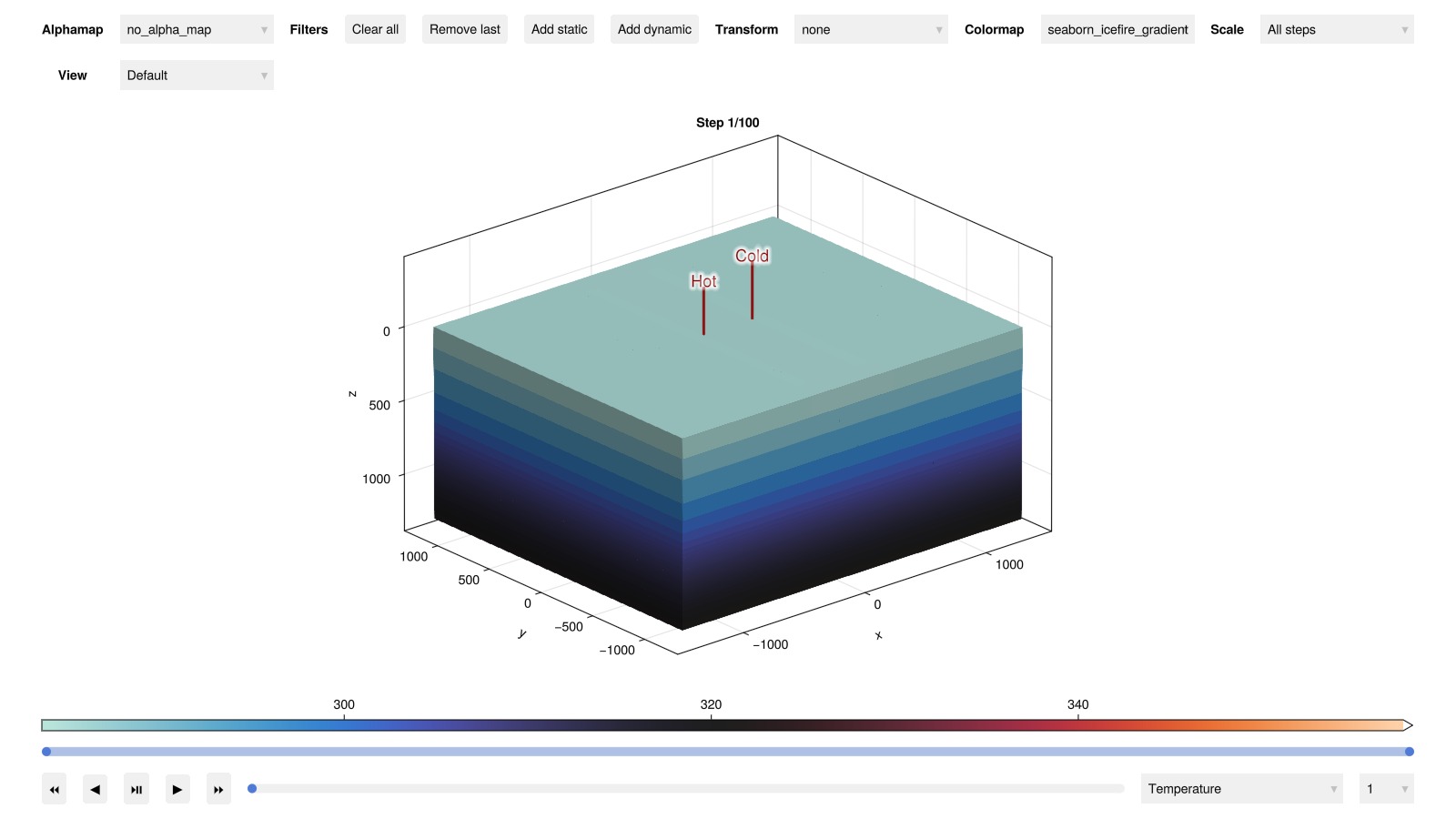 We examine the temperature field evolution throughout the simulation timeline. Interactive visualization allows exploration of thermal plume development and migration patterns around the well doublet system.