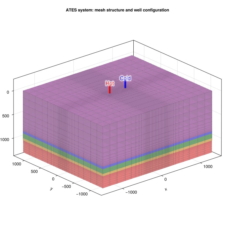 This example demonstrates comprehensive simulation and analysis of an Aquifer Thermal Energy Storage (ATES) system using Fimbul.jl. ATES systems store thermal energy by injecting hot water into subsurface aquifers during charging periods and extracting the heated water during discharge periods for heating applications.