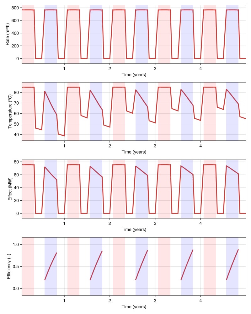 color_stages!(ax_rate)Plot water temperature at the hot well