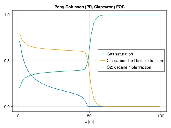 solve_and_plot_displacement(PR(components), nx, name = "Peng-Robinson (PR, Clapeyron) EOS")