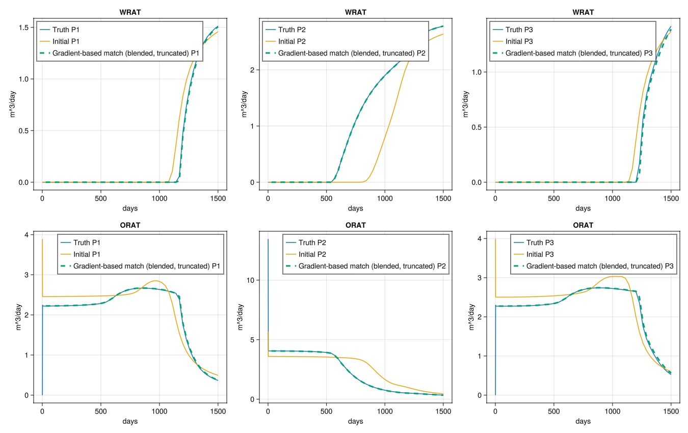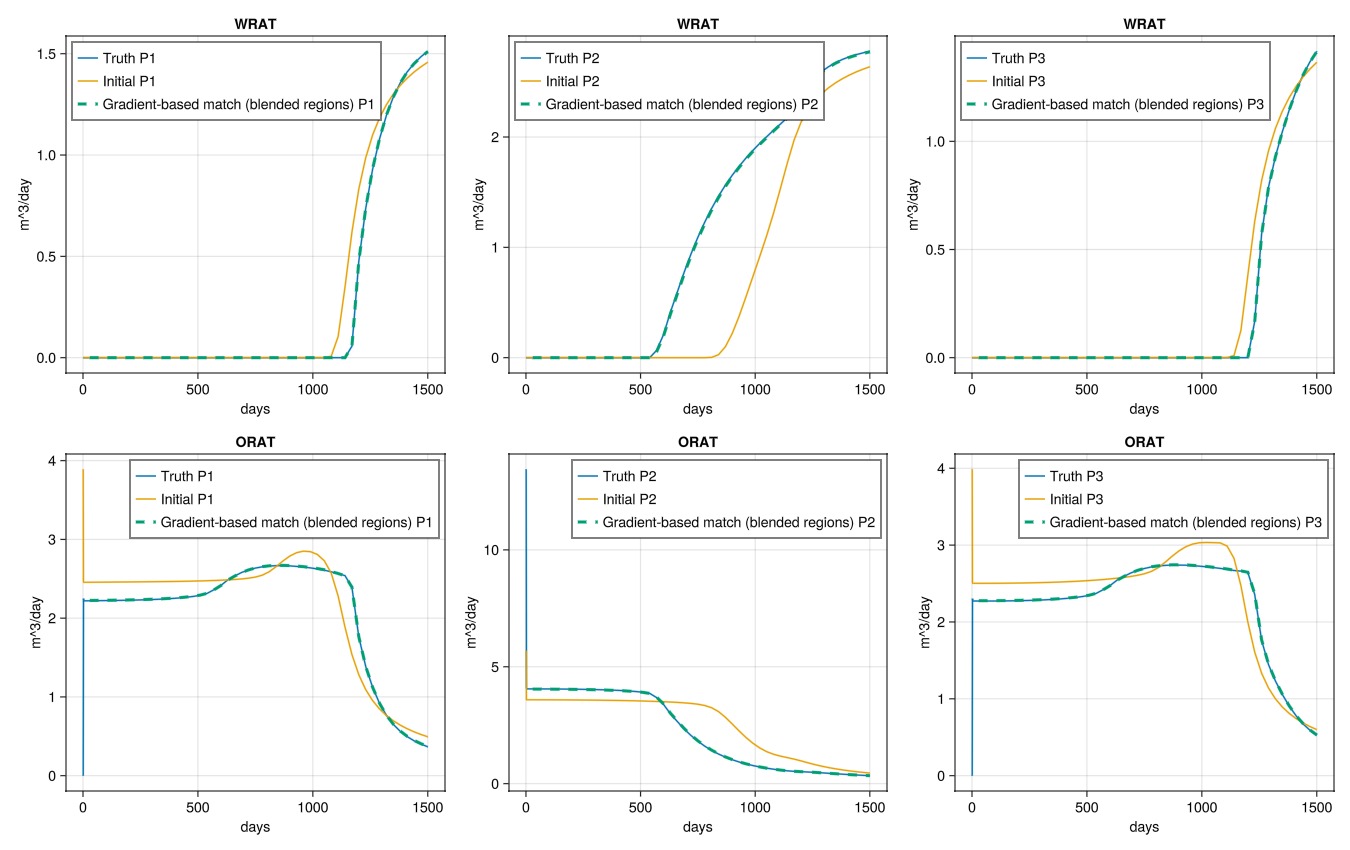 History matching is a fundamentally ill-posed problem and prior assumptions is a large part of narrowing down the problem. In this example we have seen a few different ways of looking at the same matching problem depending on the prior modeling assumptions. Gradient-based optimization is a powerful tool for history matching when you have access to a differentiable simulator. The flexibility to allow on-the-fly setup of new functional relationships and corresponding parameters in JutulDarcy nicely complements the gradients, allowing us to reframe the problem to match our prior assumptions.