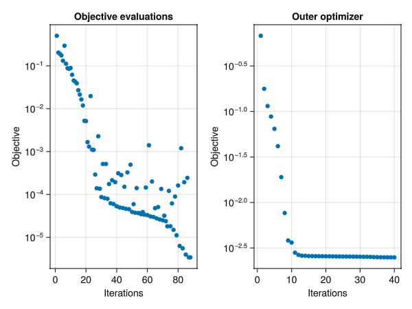ax2 = Axis(fig[1, 2], yscale = log10, title = "Outer optimizer", xlabel = "Iterations", ylabel = "Objective")