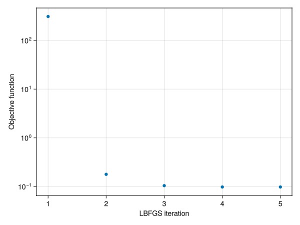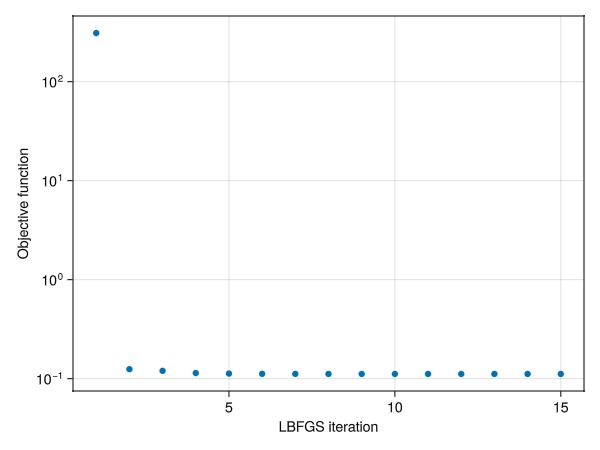 ax = Axis(fig[1, 1], xlabel = "LBFGS iteration", ylabel = "Objective function", yscale = log10)