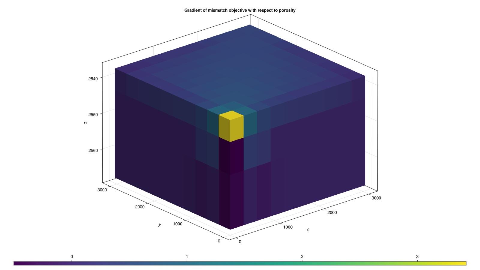 Optimization: Finished setup in 3.611538957 seconds.Plot the gradient of the mismatch objective with respect to the porosity