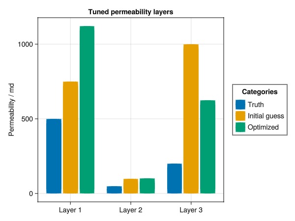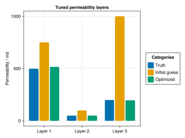The model contains three layers with different permeability. We can perturb the permeability in each layer a bit and use the lumping and scaling functionality in the optimizer to recover the original values.