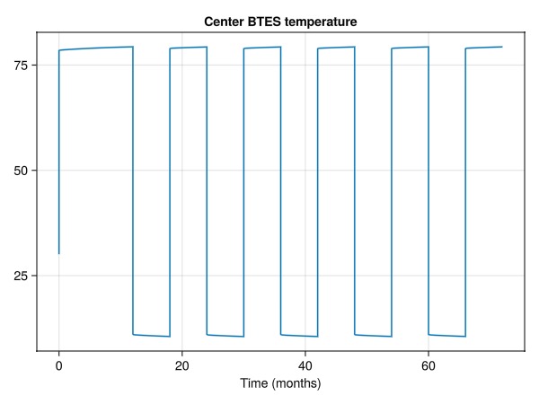 ax = Axis(fig[1, 1], title = "Center BTES temperature", xlabel = "Time (months)")