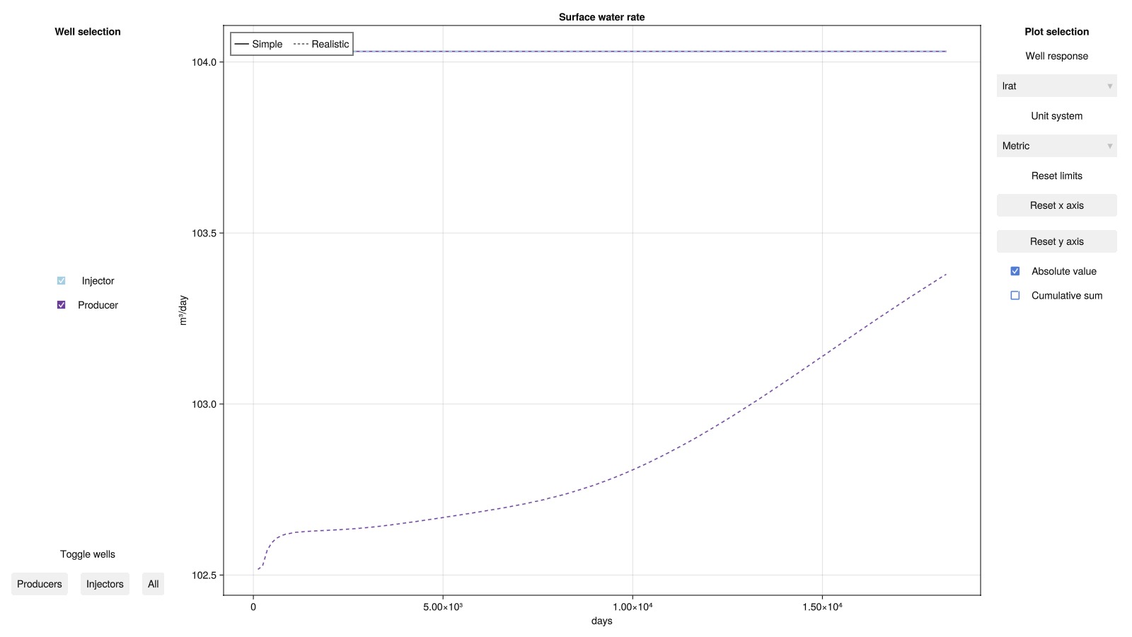 plot_well_results([results_simple.wells, results_real.wells]; names = ["Simple", "Realistic"])