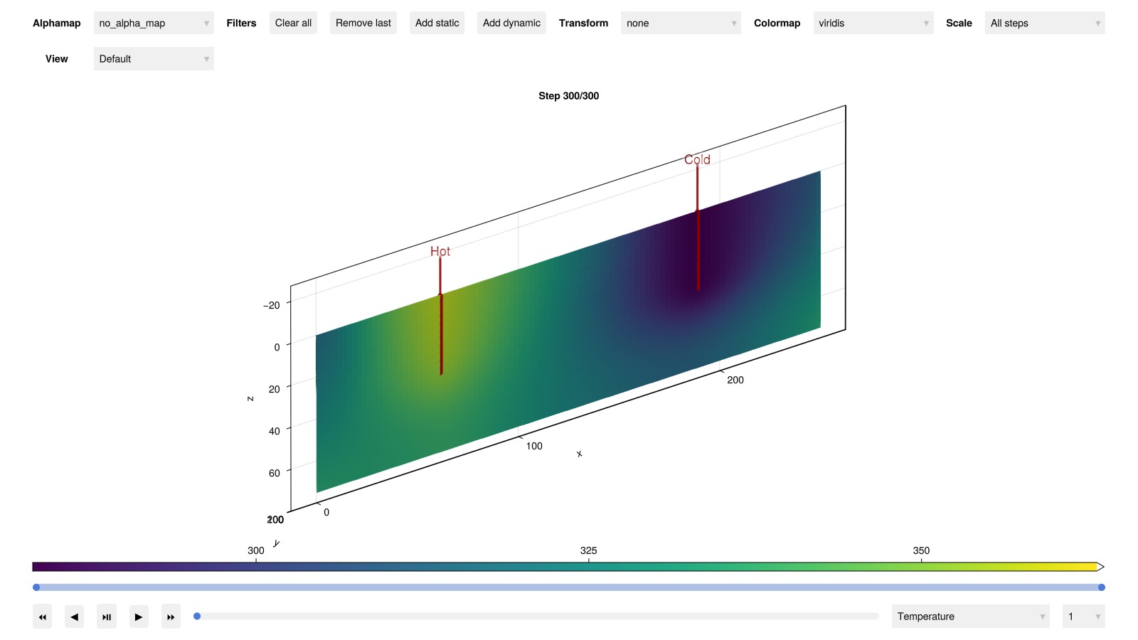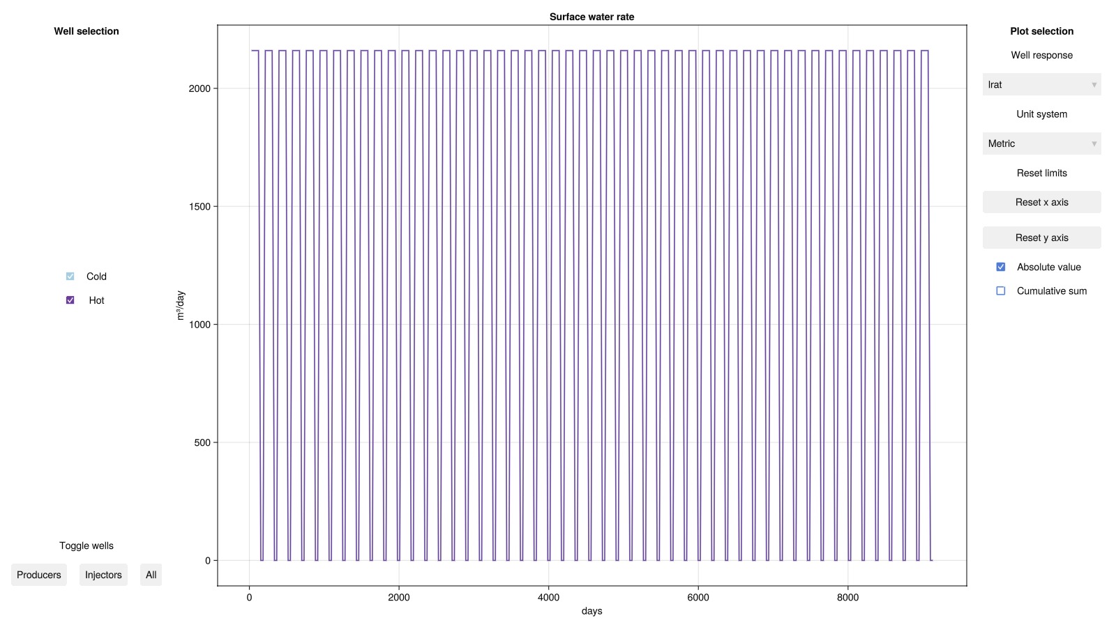 GeothermalThis example demonstrates how to simulate high-temperature aquifer thermal energy storage. We set up a simple case describing a vertical slice of a reservoir with an a main (hot) well near the left boundary, and a supporting (cold) well near the right boundary. The reservoir has boundarys condition that provides a constant pressure and temperature. We set up a yearly cycle where energy is stored from June to September, and discharged from December to March. The rest of the year is a rest period where no energy is stored or produced.