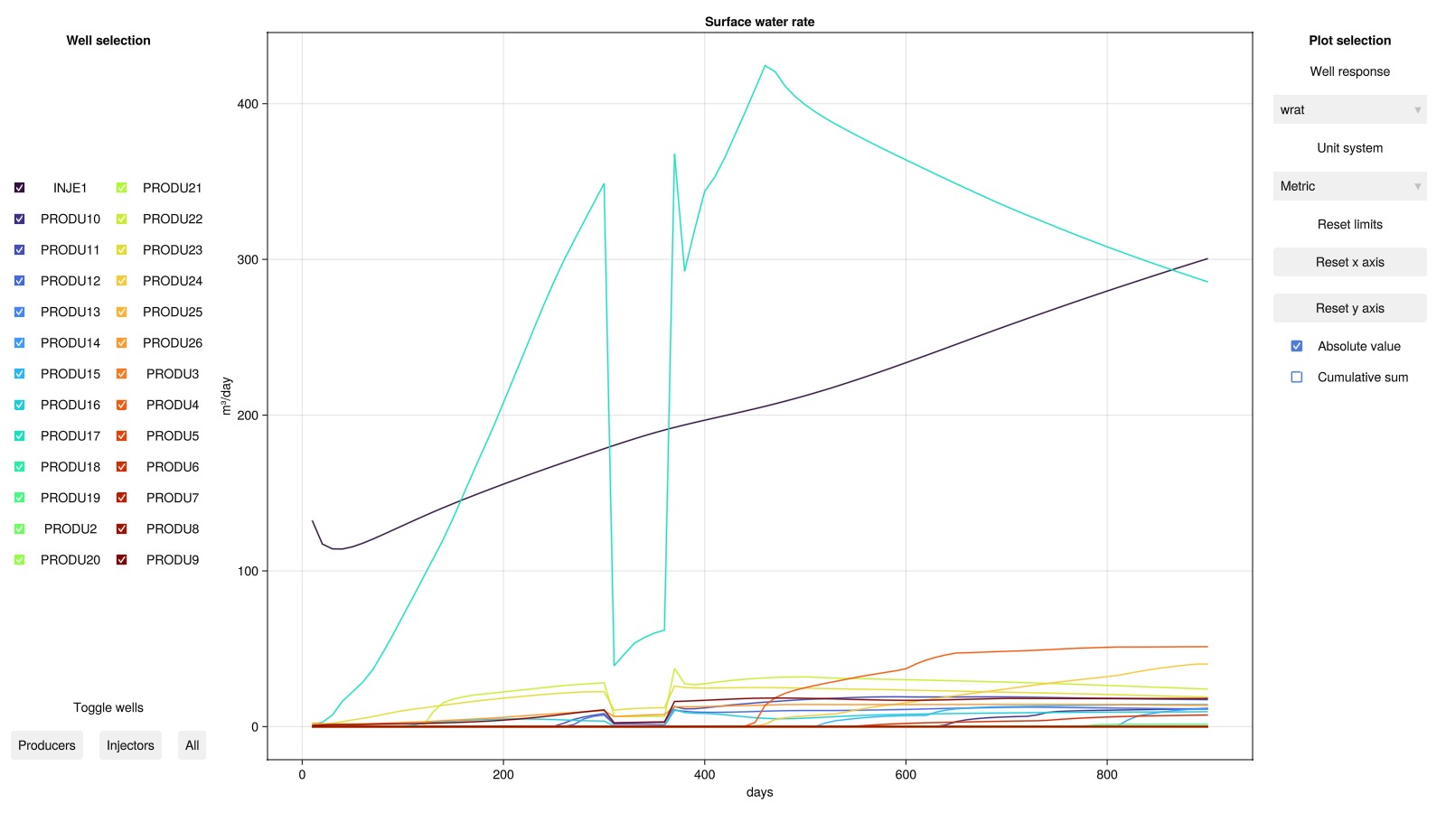 We can plot the well responses (rates and pressures) in an interactive viewer. Multiple wells can be plotted simultaneously, with options to select which units are to be used for plotting.