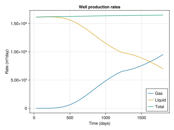 We observe that the total rate does not vary much, but the composition changes from liquid to gas as the front propagate through the domain and hits the producer well. Gas rates: