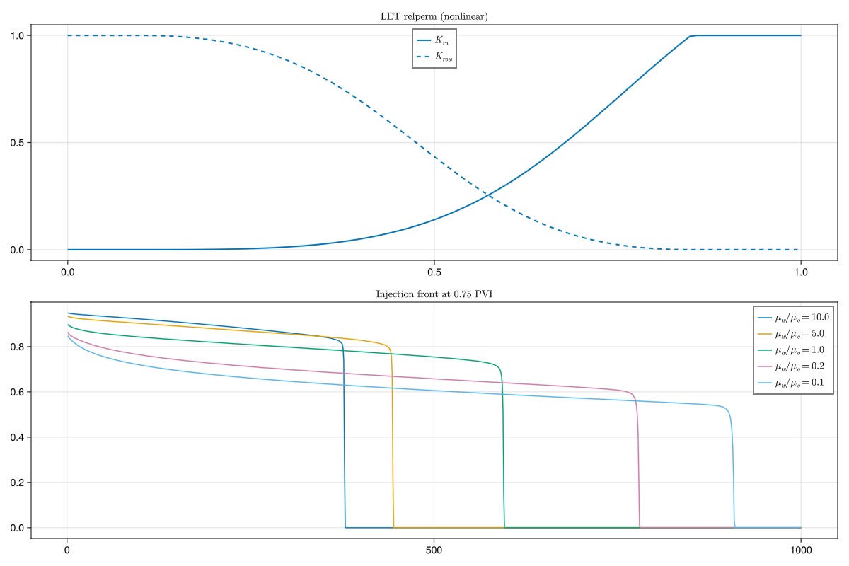 simulate_and_plot(sw, krw, krow, L"\text{LET relperm (nonlinear)}")