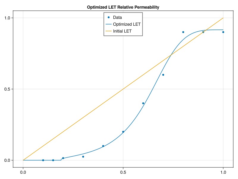 We can use either the Brooks-Corey or LET models to fit relative permeabilities to data. We generate some synthetic data and define a function that gives the sum of squares mismatch function between the data and the chosen LET model. As these functions are relatively simple Julia functions, we can use the Optim package to perform optimization to find the best fit.