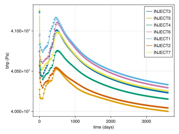 plot_comparison(wells, ref, rep_t, :bhp, injectors)