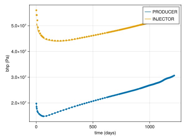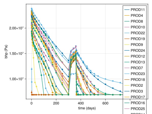 plot_comparison(wells, ref, rep_t, :bhp)