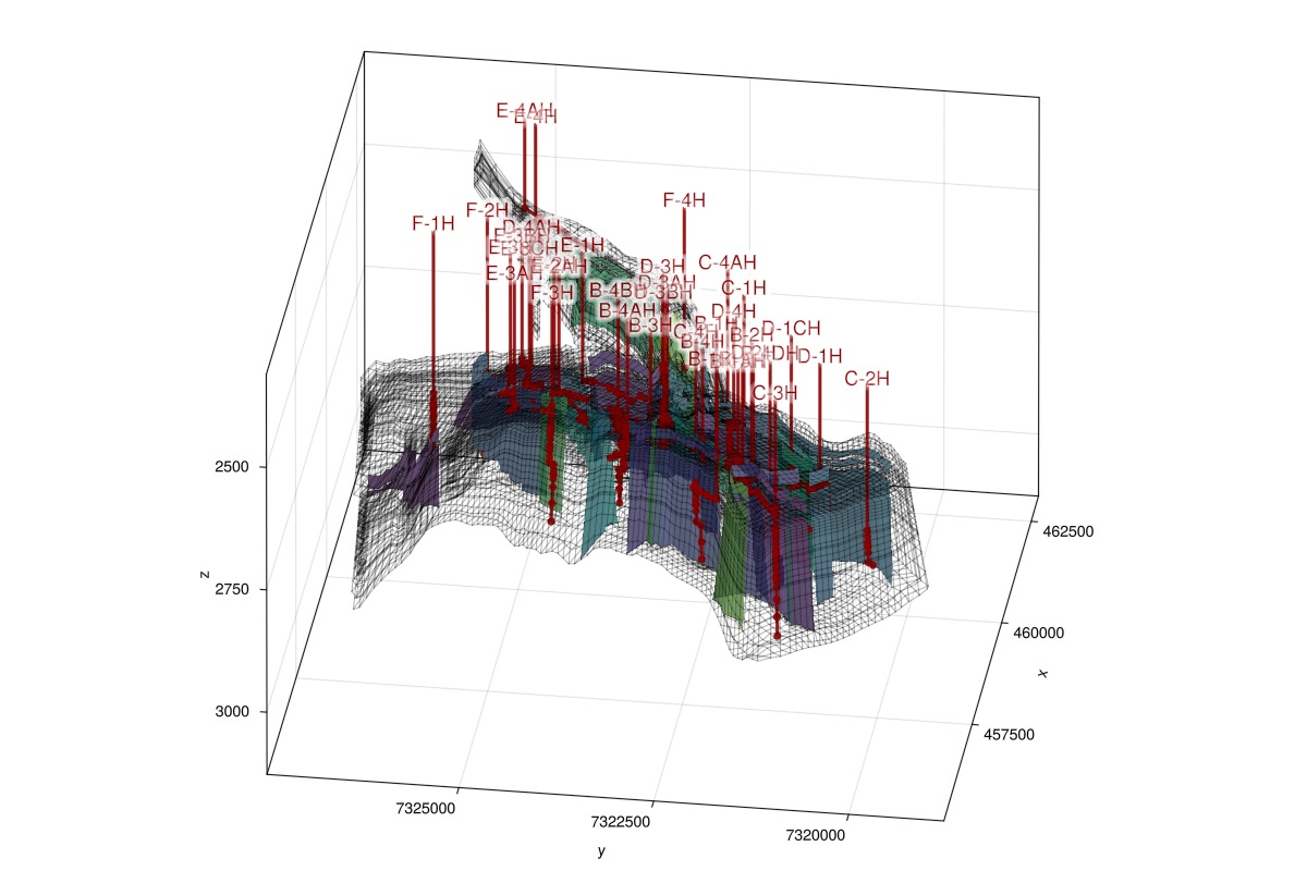 We compose a few different plotting calls together to make a plot that shows the outline of the mesh, the fault structures and the well trajectories.