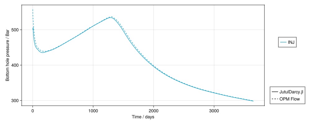 Legend(fig[4, 2], [l1, l2], ["JutulDarcy.jl", "OPM Flow"])
