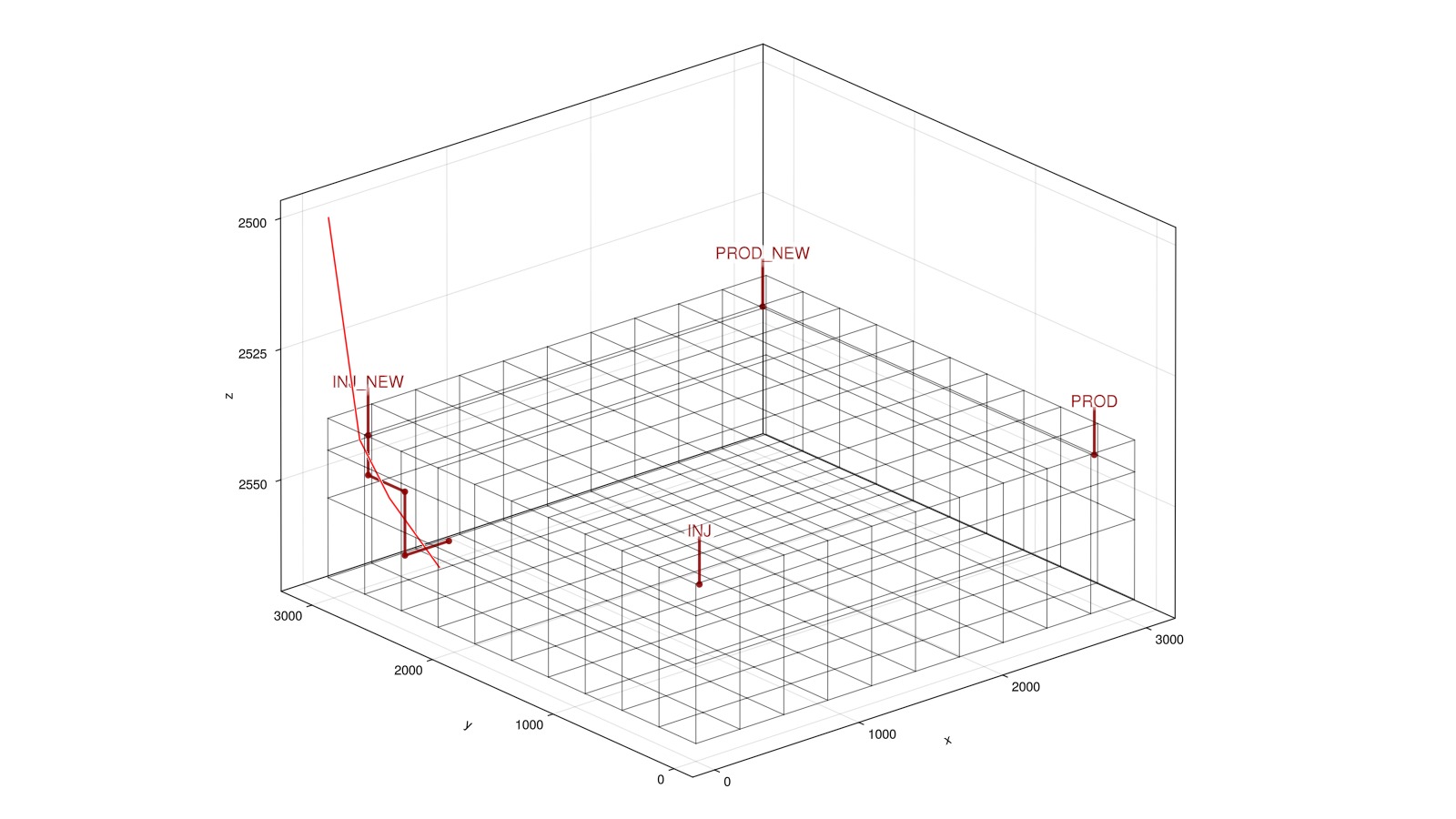 new_model = setup_reservoir_model(reservoir, model, wells = [I1, I2, P1, P2]);Visualize the new wells and the trajectory
