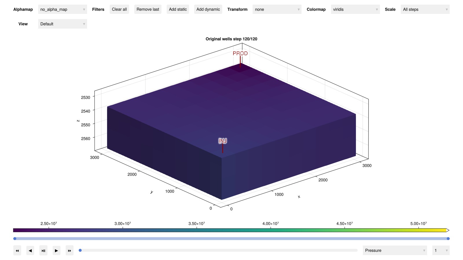 plot_reservoir(model, states, title = "Original wells", step = 120, key = :Pressure)