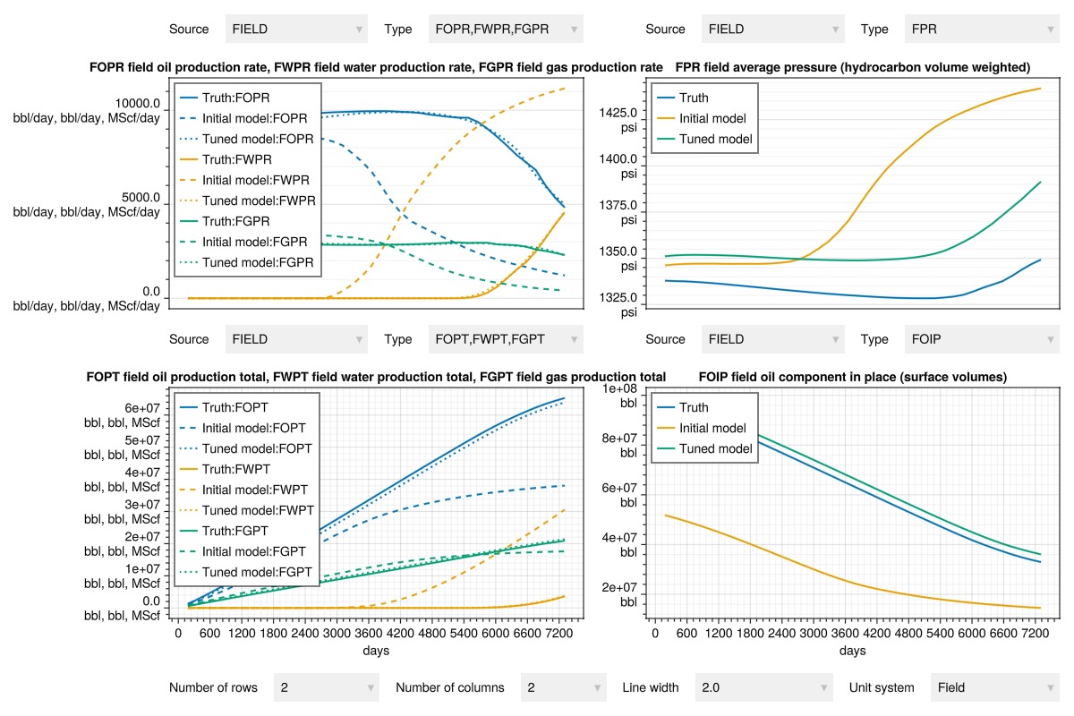 Note that the optimization reduces the mismatch significantly, but the tuned model is still different from the truth case. This is a result of the non-uniqueness of the problem, where different parameter combinations can give similar responses.