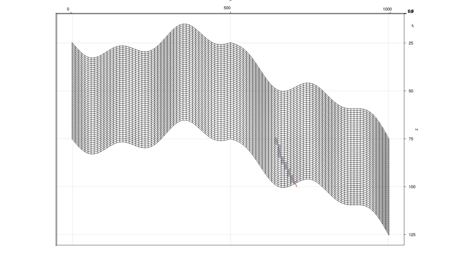 We place a single injector well. This well was unfortunately not drilled completely straight, so we cannot directly use add_vertical_well based on logical indices. We instead define a matrix with three columns x, y, z that lie on the well trajectory and use utilities from Jutul to find the cells intersected by the trajectory.