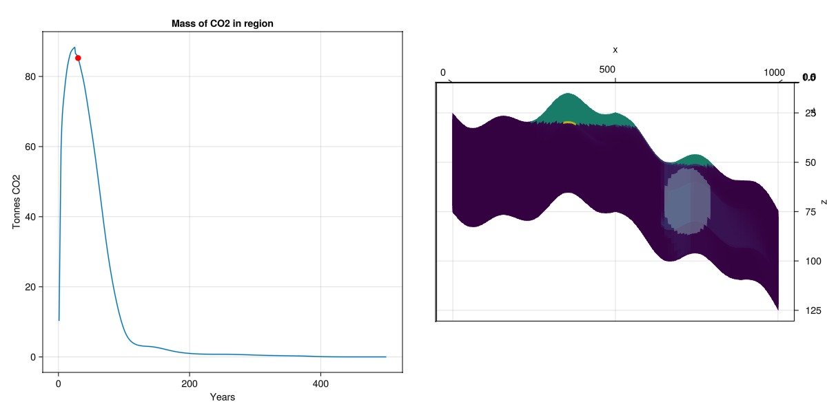 scatter!(ax1, t[stepno]./yr, co2_mass_in_region[stepno], markersize = 12, color = :red)