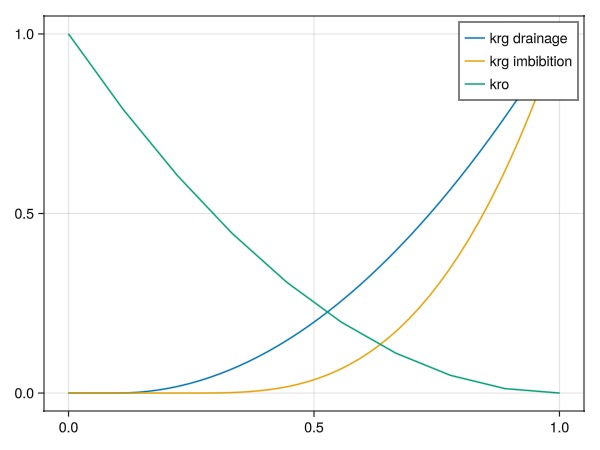 We define three relative permeability functions: kro(so) for the brine/liquid phase and krg(g) for both drainage and imbibition. Here we limit the hysteresis to only the non-wetting gas phase, but either combination of wetting or non-wetting hysteresis is supported.