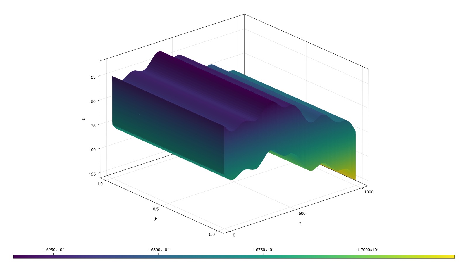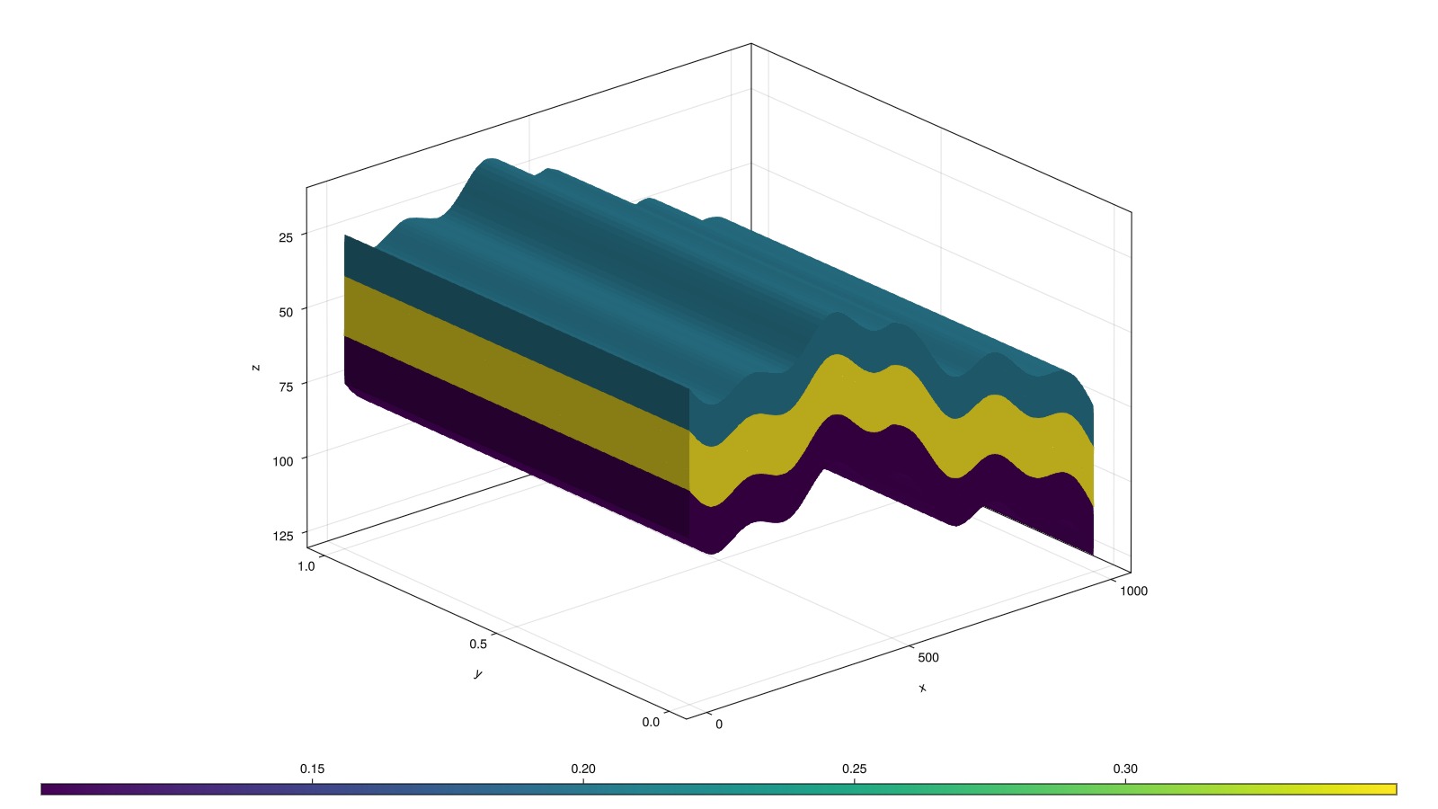 We set up a Cartesian mesh that is then transformed into an unstructured mesh. We can then modify the coordinates to create a domain with a undulating top surface. CO2 will flow along the top surface and the topography of the top surface has a large impact on where the CO2 migrates.