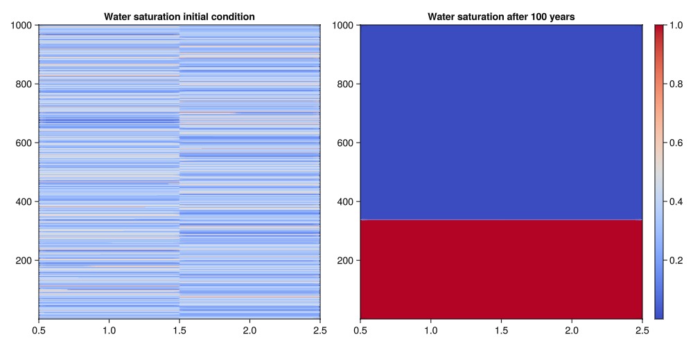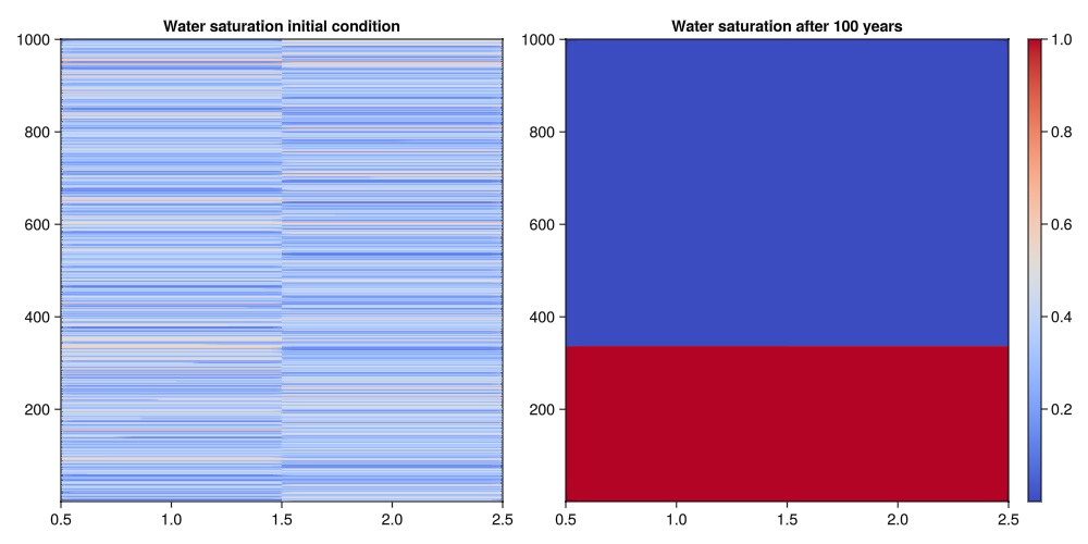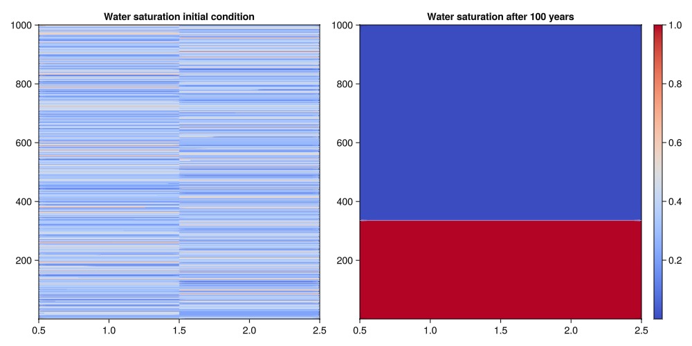 We will now plot the water saturation for the initial condition and the state after 100 years. We observe that the initially random water saturation migrates to the bottom of the model. This is expected, as the water is the heaviest phase. A similar observation could be made for the other two phases.