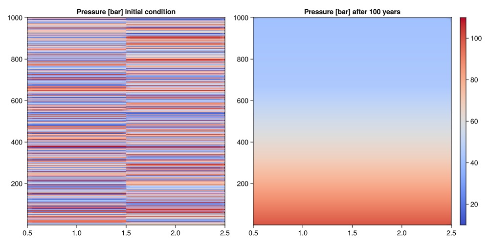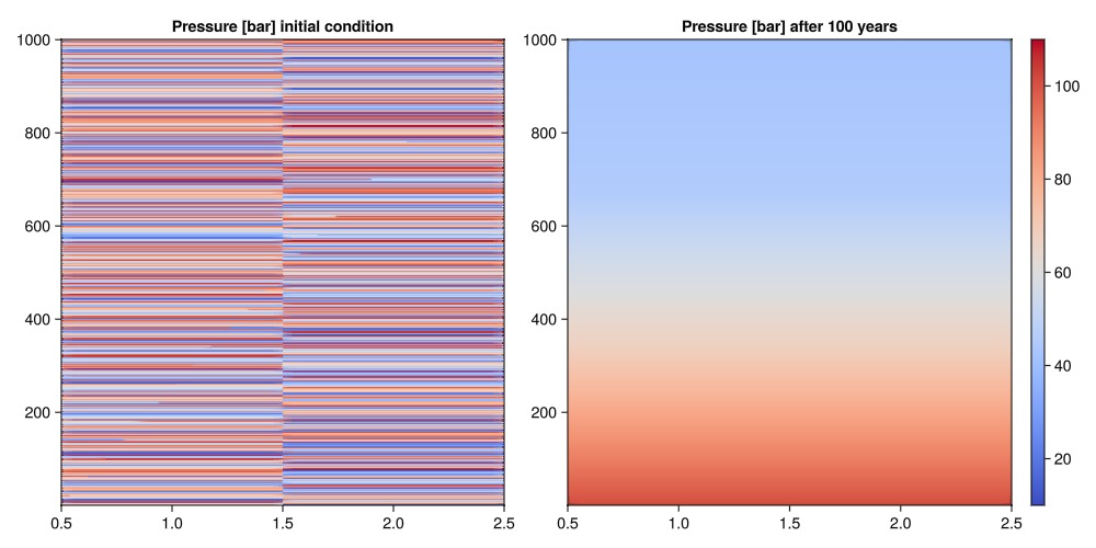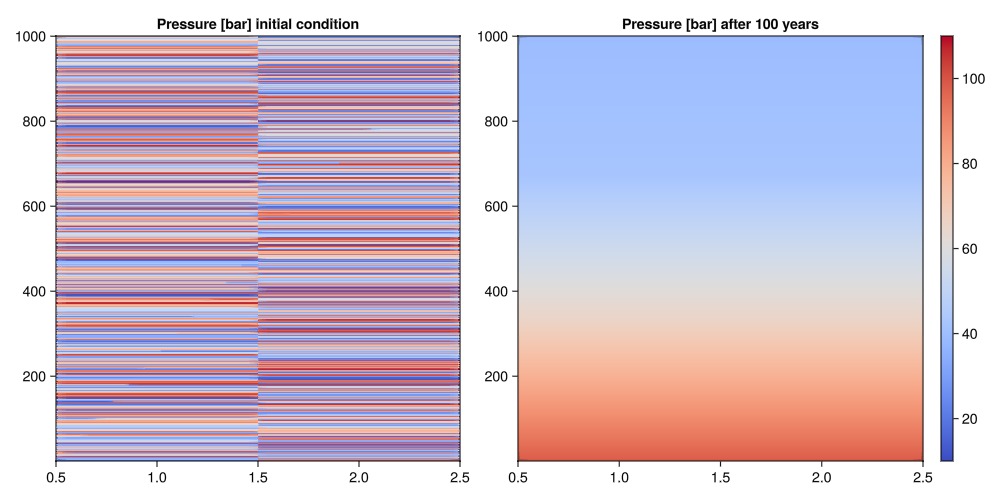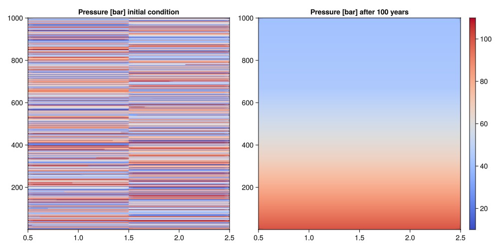 We observe that the initially constant pressure becomes a nearly linear function of depth after 100 years. This is the expected result for a model with constant and no driving forces other than gravity.