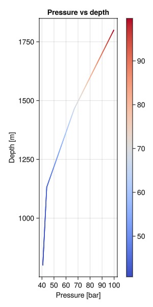 ax = Axis(fig[1, 1], title = "Pressure vs depth", ylabel = "Depth [m]", xlabel = "Pressure [bar]")