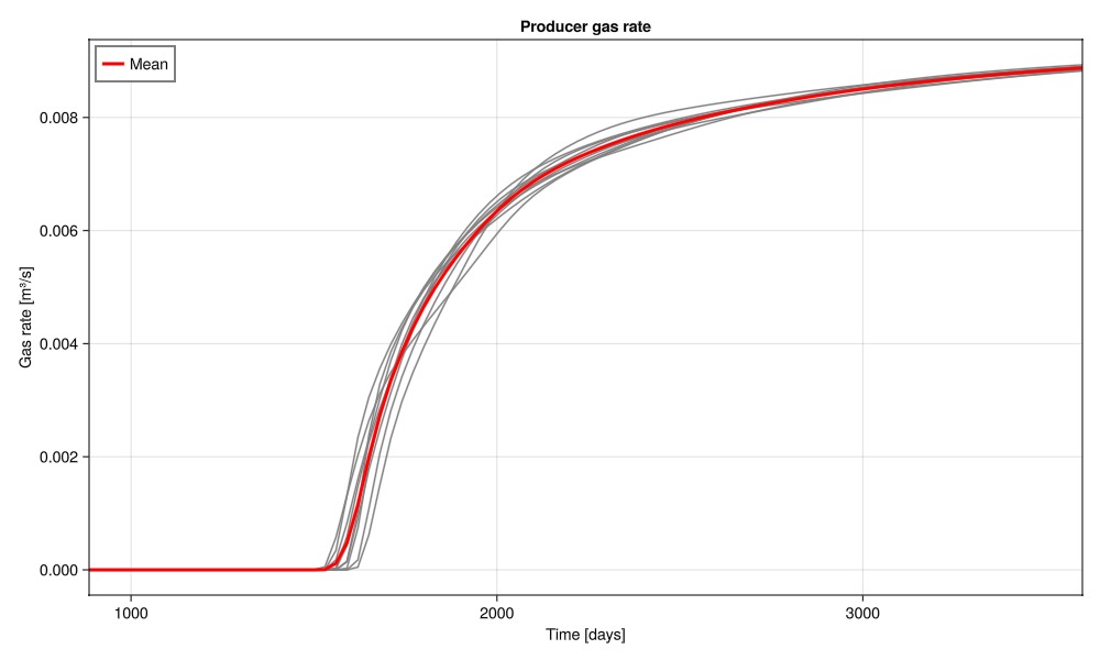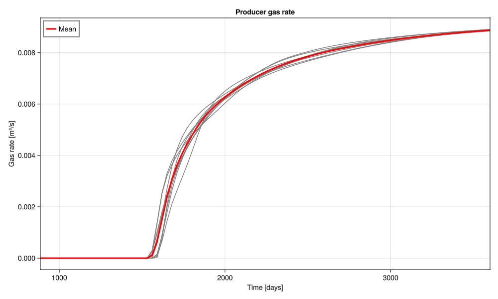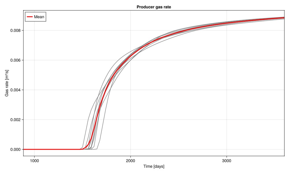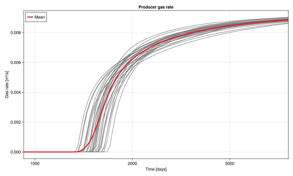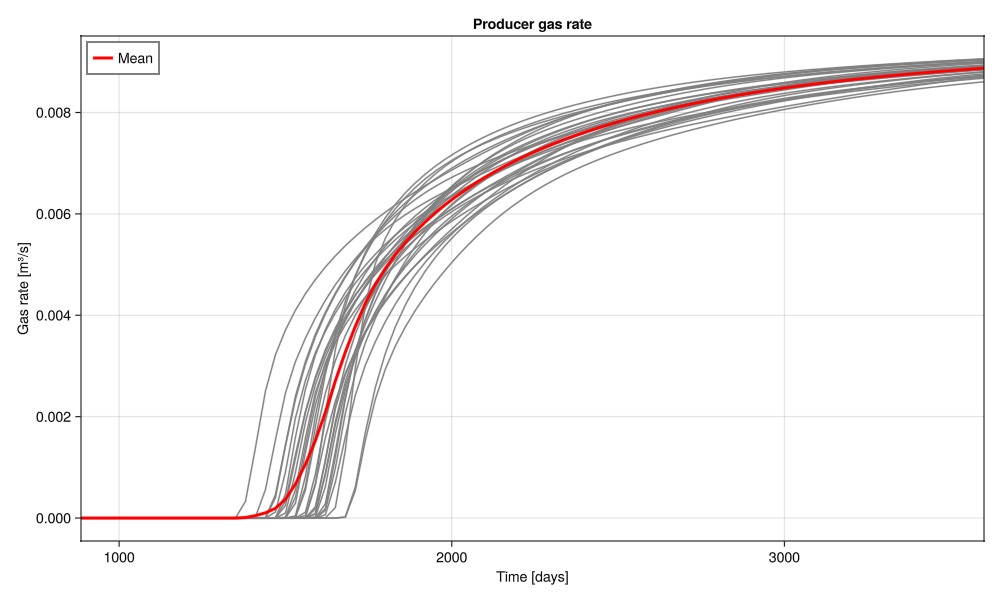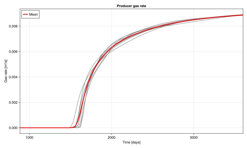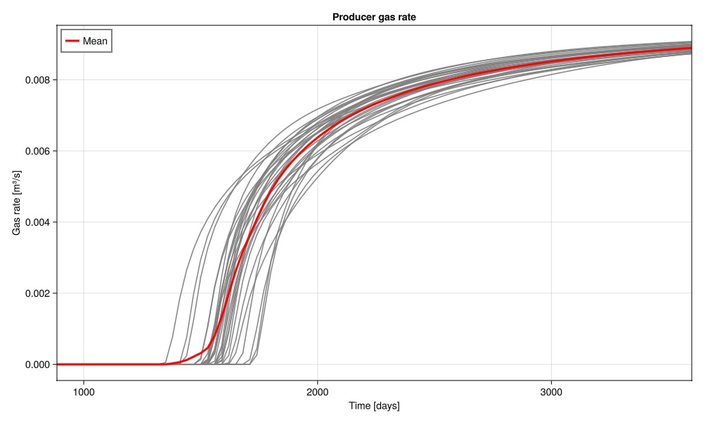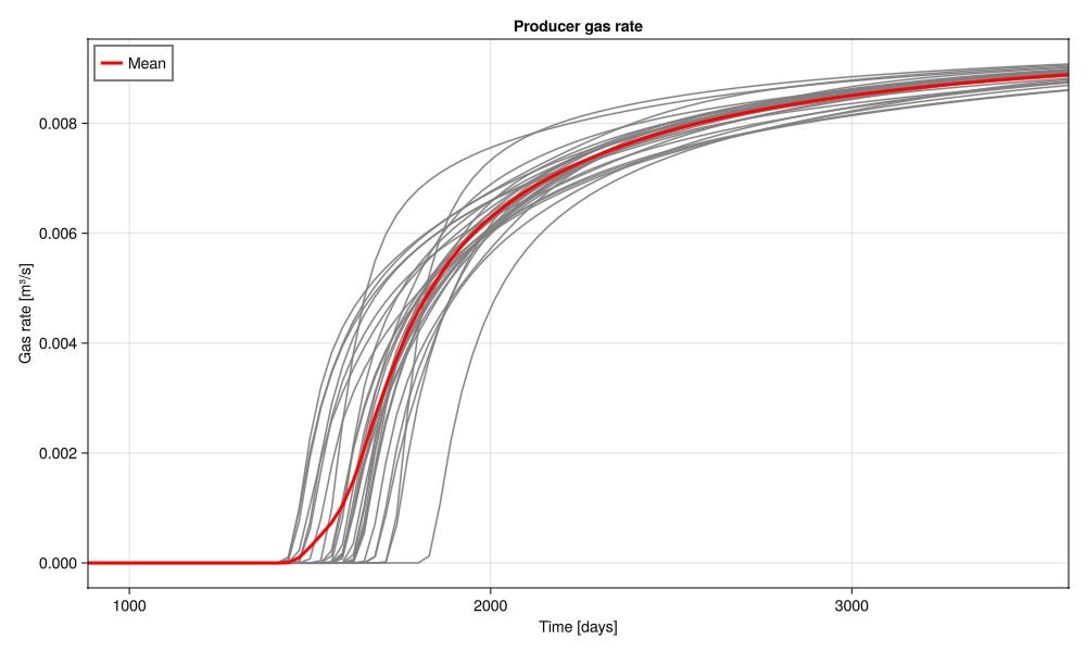 wells, saturations = simulate_porosities(porosities_uniform);Plot the gas rate at the producer over the ensemble