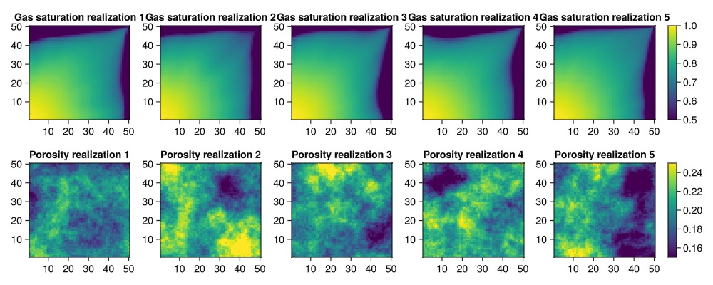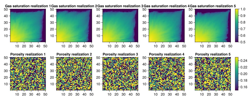 plot_realizations(saturations_gaussian, porosities_gaussian)