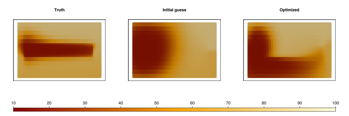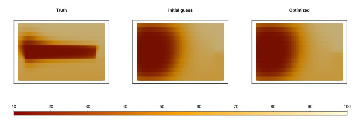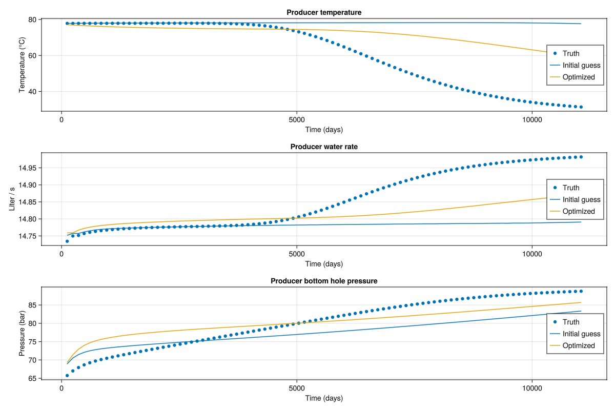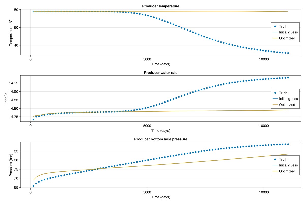 We plot the spatial results for the truth case, the initial guess, and the optimized case. The temperature is plotted in Celsius and we use the same color scale for all steps. Note that in terms of the optimizer itself, this is hidden data: The objective function only matches the well responses. Getting a good match in the spatial distribution of temperature is a side-effect of the physics and parametrization of the model, as different physics or a different parameterization could lead to good match in terms of the objective function, even without good match for the spatial distribution.