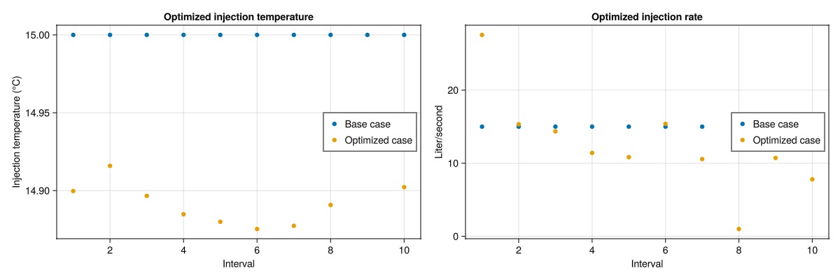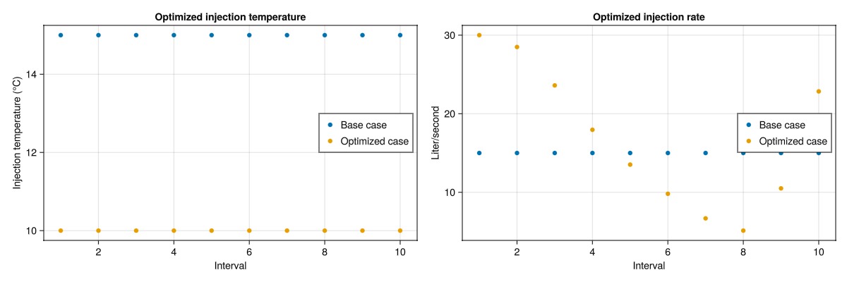 The optimized injection rates and temperatures are plotted for each interval. The base case is shown in blue, while the optimized case is shown in orange. Note that the optimized case has reduced the injection temperature to the lower limit for all steps, and instead increase the injection rate significantly. The injection rate has a decrease part-way during the simulation, which increases the residence time of the injected water, allowing additional heat to be siphoned from the low permeable layers.