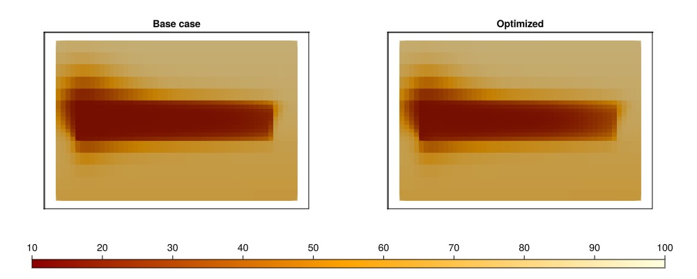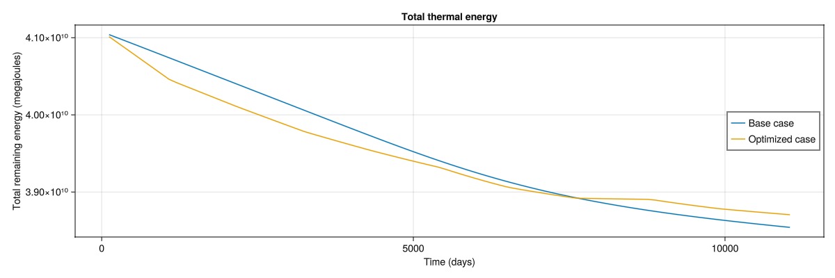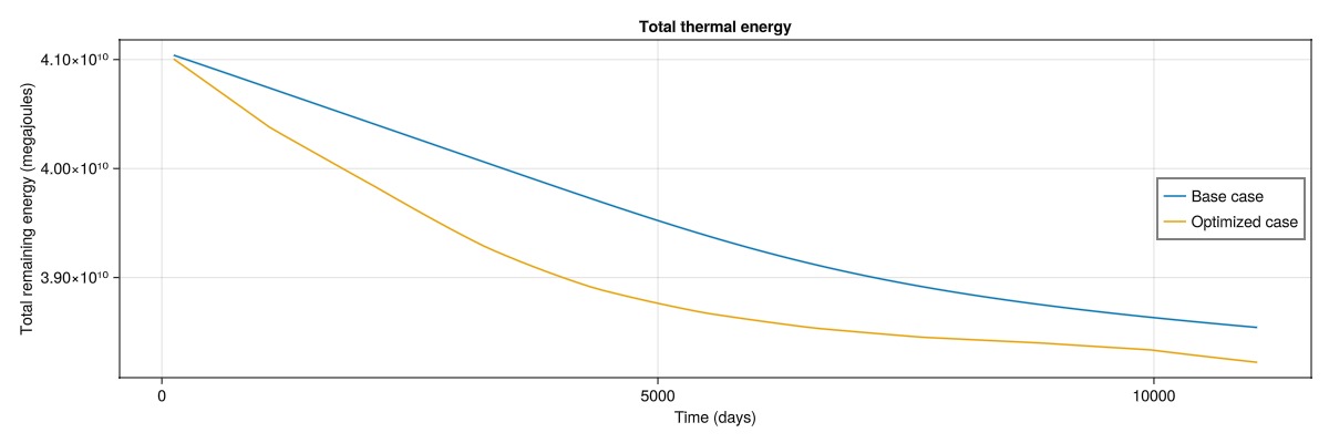The total thermal energy in the reservoir is computed as the sum of the thermal energy in each cell, which is the result of the rock heat capacity, porosity, fluid heat capacity and the temperature in each cell. The optimized strategy significantly decreases the remaining thermal energy in the reservoir, while still producing less cost than the base case according to our objective. The 2D nature of this problem makes it easy to recover a large amount energy, as the majority of the cells are swept by the cold front.