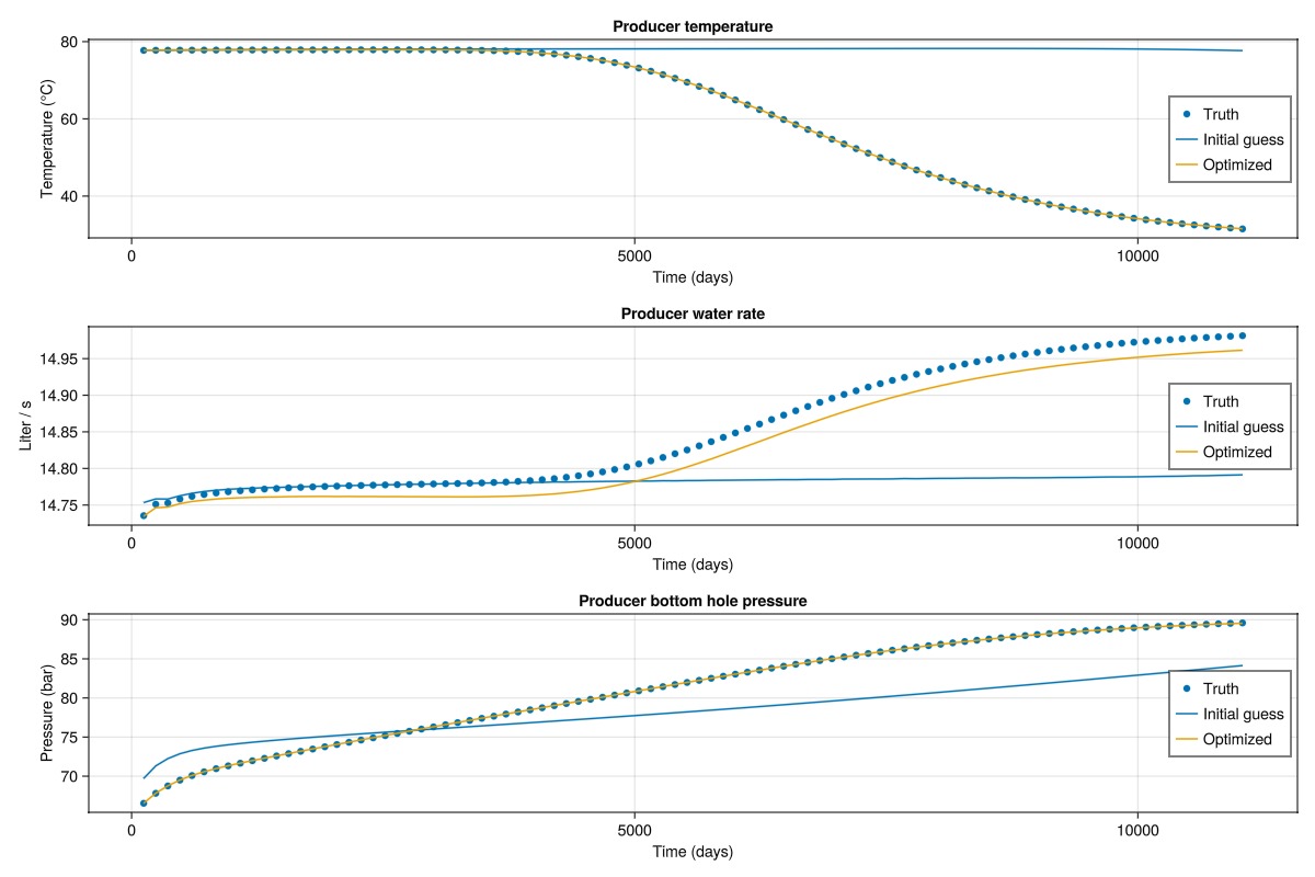 We plot the well responses for the producer temperature, producer water rate, and injector bottom hole pressure. These values represent the data used in the objective function. We observe good match, which is consistent with the reduction in the objective function valeu during the optimization.