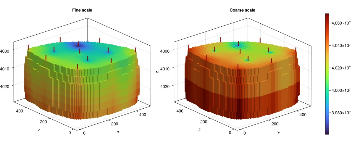 The fine-scale and coarse-scale permeability fields are compared visually. The coarsening uses a static upscaling, where the permeability is harmonically averaged per direction when coarsening. This is a simple method that can be effective enough for many cases.