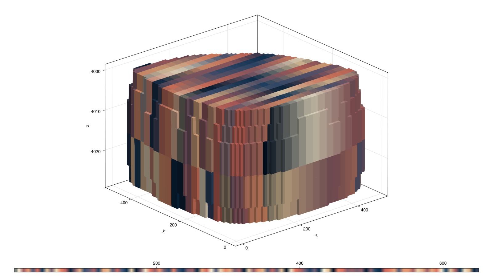 We coarsen the model using a partition size of 20x20x2 and the IJK method where the underlying structure of the mesh is used to subdivide the blocks. This function automatically handles inactive cells and disconnected blocks and can therefore also work on more complex models.