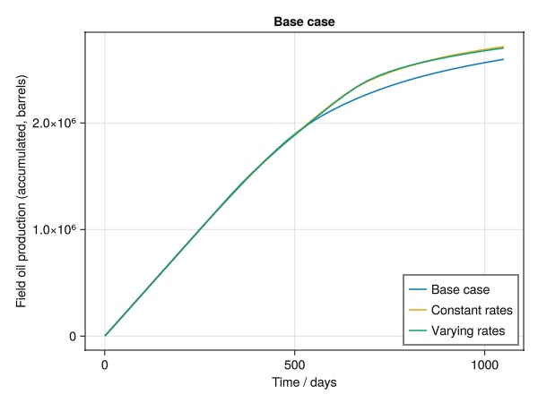 ax = Axis(fig[1, 1], xlabel = "Time / days", ylabel = "Field oil production (accumulated, barrels)", title = "Base case")