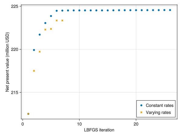 case1, hist1, x1 = optimize_rates(:first);Rate optimization: steps=:first selected, optimizing one set of controls for all steps.