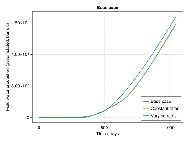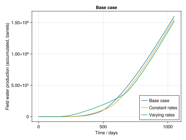 ax = Axis(fig[1, 1], xlabel = "Time / days", ylabel = "Field water production (accumulated, barrels)", title = "Base case")