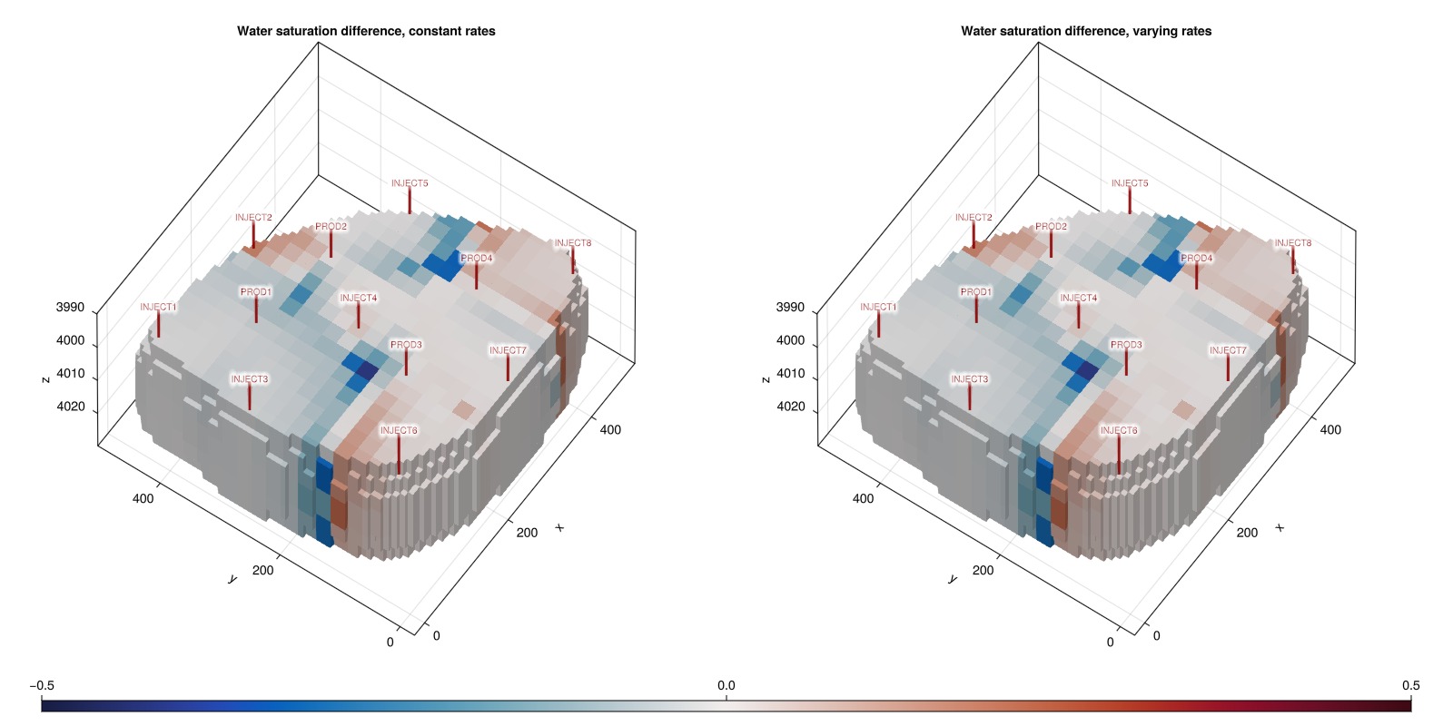 ax = Axis3(fig[1, 2], zreversed = true, title = "Water saturation difference, varying rates")