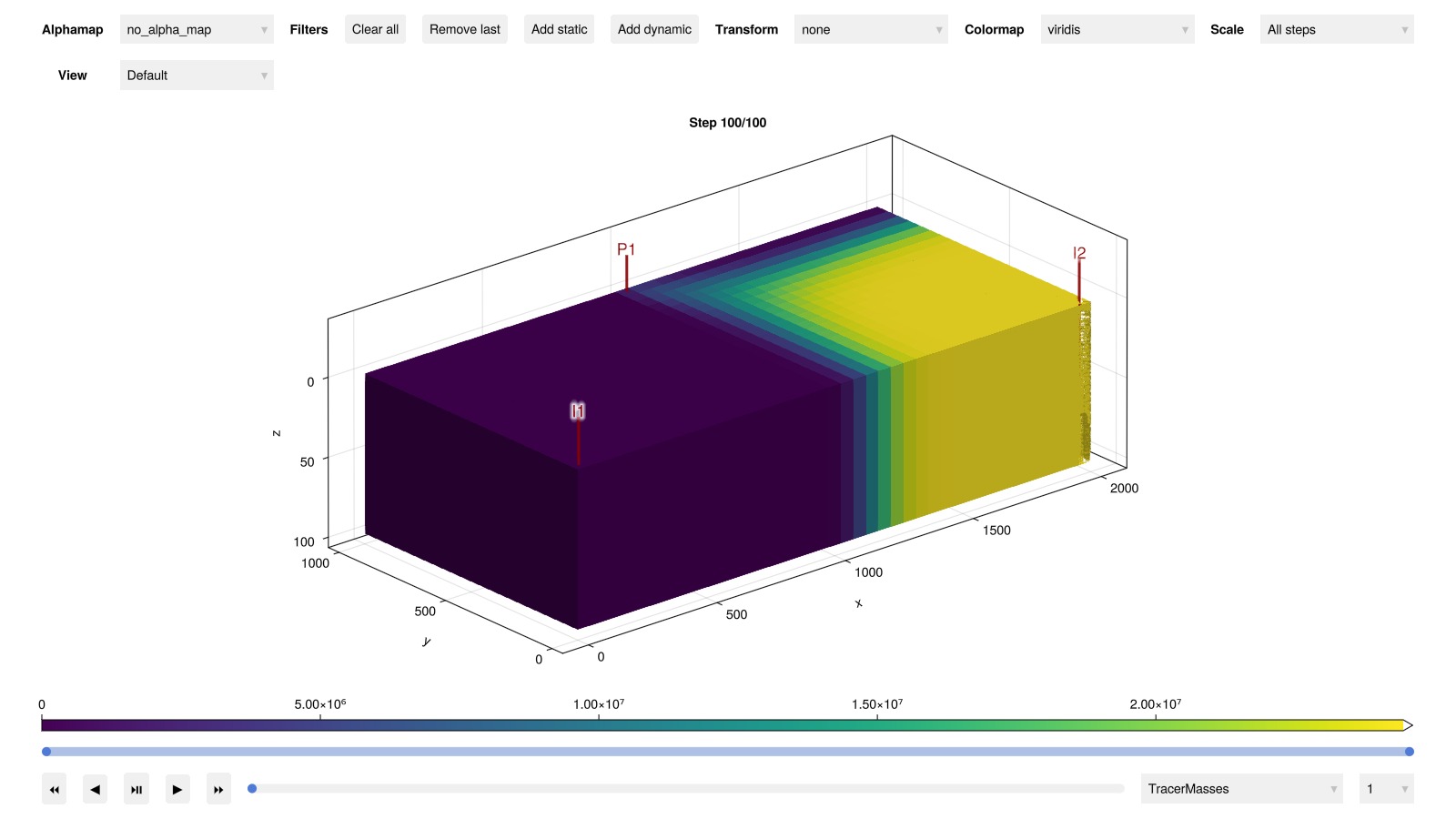 Note that the fluid front has filled most of the domain. The tracers give us additional information about what water volume comes from a specific injector.