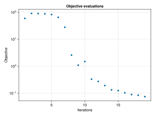 ax1 = Axis(fig[1, 1], yscale = ys, title = "Objective evaluations", xlabel = "Iterations", ylabel = "Objective")