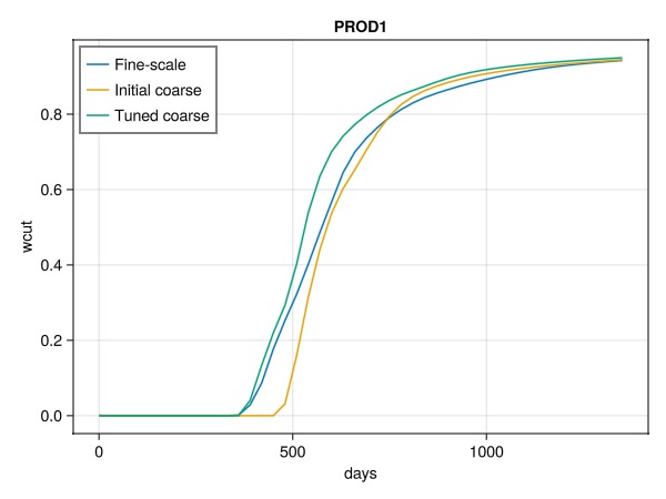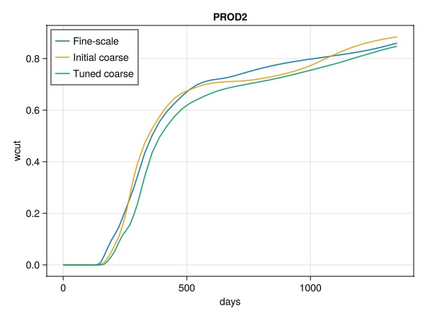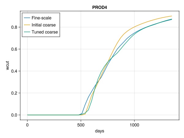 We next compare individual wells to see how the optimization has affected the match between the coarse scale and fine scale. As we can see, we have reasonably good match between the original model with about 18,000 cells and the coarse model with about 3000 cells. Even better match could be possible by adding more coarse blocks, or also optimizing for example the relative permeability parameters for the coarse model.