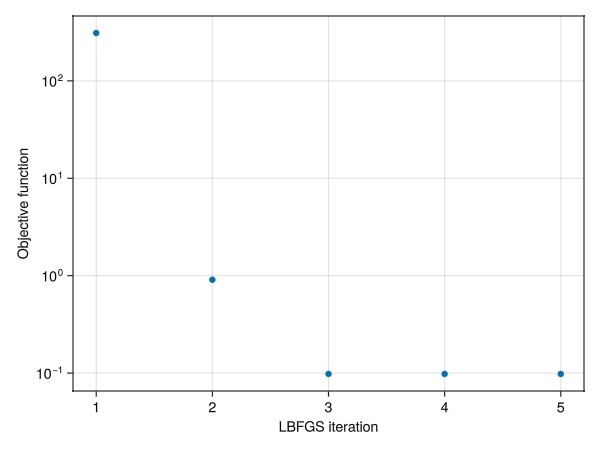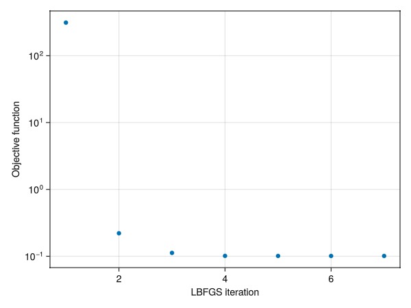 ax = Axis(fig[1, 1], xlabel = "LBFGS iteration", ylabel = "Objective function", yscale = log10)