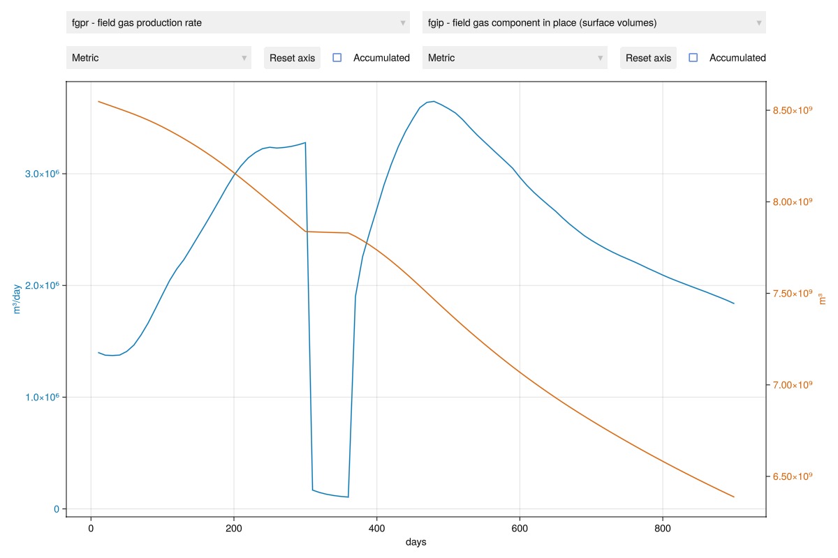 Similar to the wells, we can also plot field-wide measurables. We plot the field gas production rate and the average pressure as the initial selection. If you are running this case interactively you can select which measurables to plot.