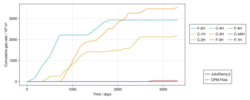 plot_well_comparison(:grat, inj, "Cumulative gas surface injection rate", cumulative = true)
